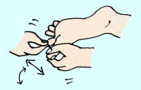 | 2)足の指の親指と二指を摘んで、横にぐっと開いてから前後に交差するように動かします。二指三指、 三指四指、四指小指とそれぞれ動かします | ![]() |